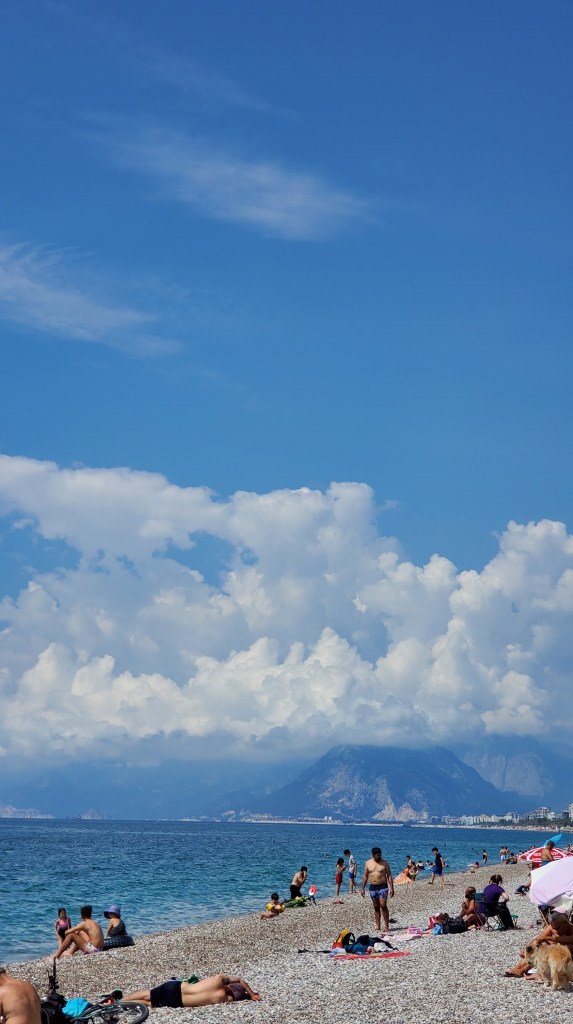 Yet, if you are looking for a more relaxing vacation, with not so much walking and early mornings, there are still ways to enjoy the Turkish coast.๐ I recommend trying different beaches as each one has something different. For example, on Lara Beach, there are people selling Oyster snacks for 1 TL and the ground is sandy (like we are used to). On the other hand, Konyaaltฤฑ Beach (which is actually a pretty new one) has stones instead of sand, has more facilities like toilets, changing rooms and showers, plus restaurants and an observatory.